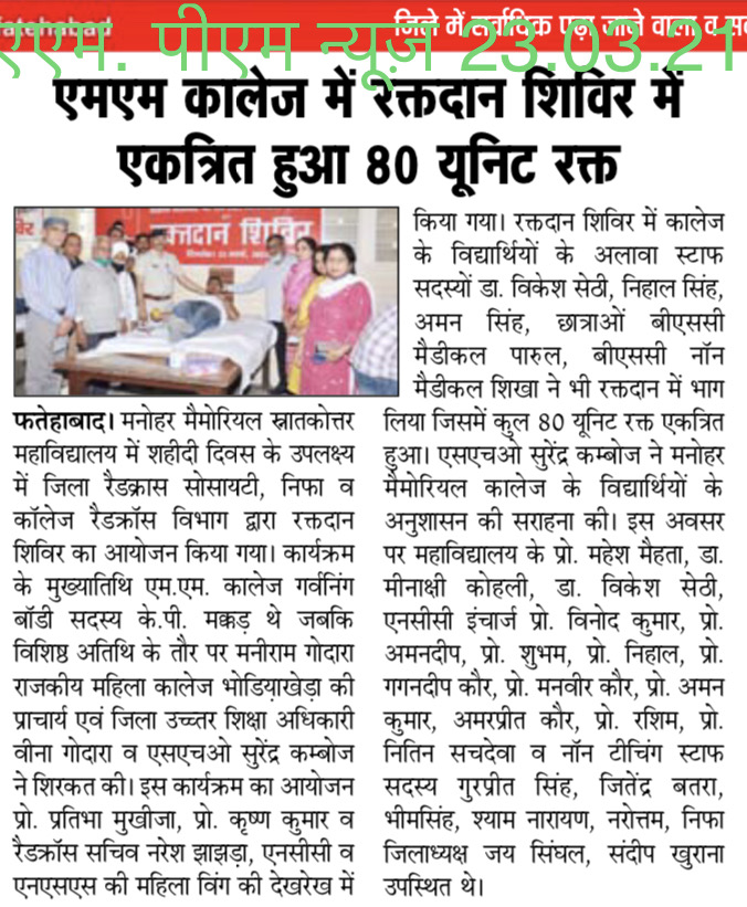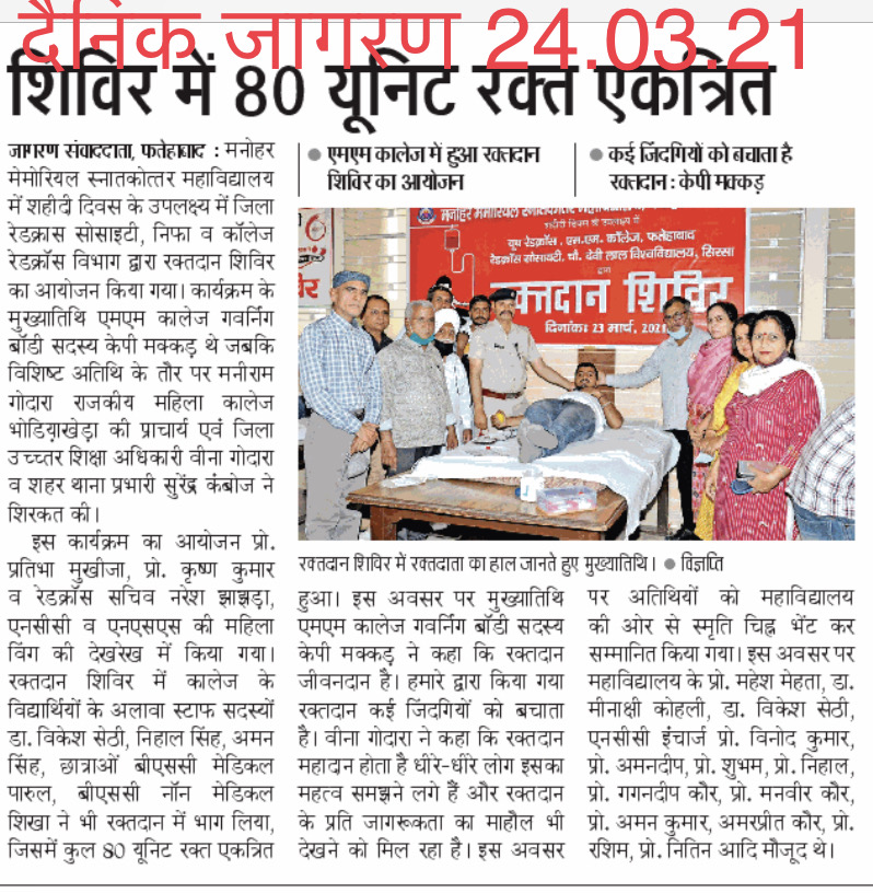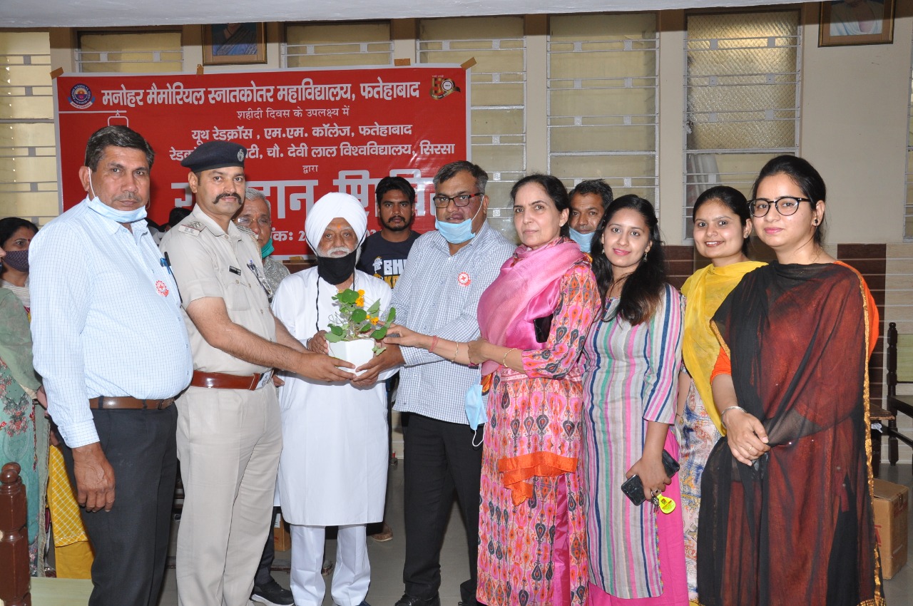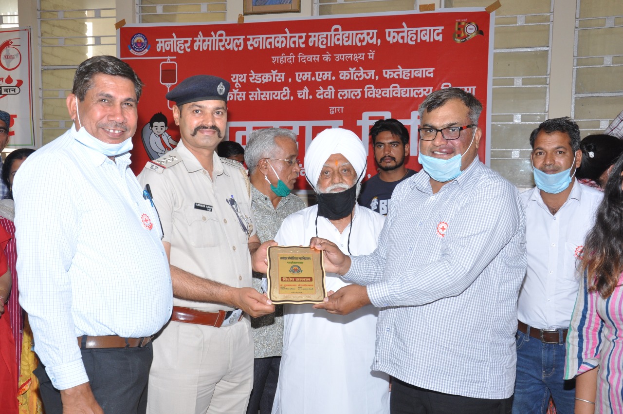 M. M. College honored by District Red Cross Society, Fatehabad on the occasion of Blood Donar Day at Gurudwara Singh Sabha, Fatehabad