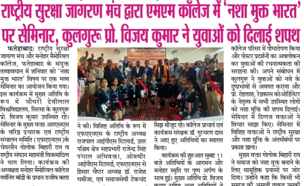 राष्ट्रीय सुरक्षा जागरण मंच द्वारा एमएम कॉलेज में ‘नशा मुक्त भारत’ पर सेमिनार, कुलगुरू प्रो. विजय कुमार ने युवाओं को दिलाई शपथ फतेहाबाद। राष्ट्रीय सुरक्षा जागरण मंच और मनोहर मैमोरियल कॉलेज, फतेहाबाद के संयुक्त तत्वावधान में शनिवार को ‘नशा मुक्त भारत’ विषय पर एक भव्य सेमिनार का आयोजन किया गया। इस कार्यक्रम में मुख्य अतिथि के रूप में चौधरी देवीलाल विश्वविद्यालय, सिरसा के कुलगुरू प्रो. विजय कुमार उपस्थित रहे। सेमिनार के मुख्य वक्ता आरएसएस के वरिष्ठ प्रचारक एवं राष्ट्रीय संचालन समिति (एफएएनएस)के चेयरमैन गोलोक बिहारी राय व राष्ट्रीय संगठन महामंत्री विक्रमादित्य ने भाग लिया। कार्यक्रम की अध्यक्षता मनोहर मैमोरियल कॉलेज गर्वनिंग बॉडी के प्रधान राजीव बतरा ने की। विशिष्ट अतिथि के रूप में एफएएनएस के राष्ट्रीय अध्यक्ष राजपाल आईपीएस रिटायर्ड, उत्तर पश्चिम क्षेत्र सहप्रभारी राजेन्द्र सिंह पंघाल अधिवक्ता, ओमवीर आईपीएस रिटायर्ड, एफएएनएस से हिसार चैप्टर अध्यक्ष डॉ. राजेश धमीजा, एवं समाजसेवी टेकचंद मिढ़ा मौजूद रहे। कॉलेज प्राचार्य एवं कार्यक्रम संरक्षक डॉ. गुरचरण दास ने आए हुए अतिथियों का स्वागत किया। कार्यक्रम की शुरुआत सुबह 11 बजे अतिथियों के आगमन और मनोहर स्मृति पर पुष्प अर्पण के साथ हुई। मुख्य अतिथि प्रो. विजय कुमार सहित अन्य अतिथियों ने कॉलेज परिसर में पौधारोपण किया और पोस्टर प्रदर्शनी का अवलोकन कर युवाओं की रचनात्मकता की सराहना की। अपने संबोधन में कुलगुरू ने युवाओं को नशे के दुष्प्रभावों से अवगत कराया और प्रो. रोहताश, रेडकास कोओर्डिनेटर के नेतृत्व में सभी उपस्थित लोगों को नशा मुक्ति की शपथ दिलाई। सेमिनार में दिग्गज वक्ताओं ने विचार साझा किए। सेमिनार में विशिष्ट वक्ताओं ने राष्ट्रीय सुरक्षा और नशा मुक्ति के अंतर्संबंधों पर प्रकाश डाला। मुख्य वक्ता गोलोक बिहारी राय ने समाज को नशा मुक्त बनाने के लिए सामूहिक प्रयासों पर जोर दिया। उन्होंने कहा कि किसी भी समाज की असली ताकत उसकी युवा शक्ति होती है लेकिन आज सबसे बड़ी चिंता यह है कि हमारी युवा पीढ़ी तेजी से नशे की दलदल में धंसती जा रही है। युवा पीढ़ी को नशे से दूर कर देश और समाज के विकास में लगाना, हम सबकी सामूहिक जिम्मेवारी है। विक्रमादित्य, राष्ट्रीय संगठन महामंत्री, एफएएनएस और डॉ. राजेश धमीजा ने भी युवाओं को संबोधित किया। प्राचार्य डॉ. गुरचरन दास ने कॉलेज की गतिविधियों के बारे में जानकारी दी। इस अवसर पर राष्ट्रीय सेवा योजना की पुस्तक का विमोचन भी किया गया। समापन अवसर पर कॉलेज प्रबंधन समिति द्वारा मुख्य अतिथि प्रो. विजय कुमार को स्मृति चिन्ह भेंट कर सम्मानित किया गया। यूथ रैडकास कोओर्डिनेटर डॉ. मीनाक्षी कोहली