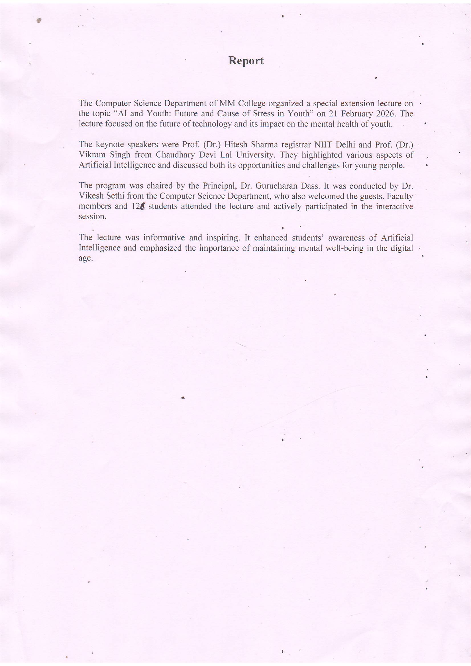 The lecture on the topic “AI and Youth: Future and Cause of Stress in Youth” focused on the future of technology and its impact on the mental health of youth. The lecture was informative and inspiring. It enhanced students’ awareness of Artificial Intelligence and emphasized the importance of maintaining mental well-being in the digital age.