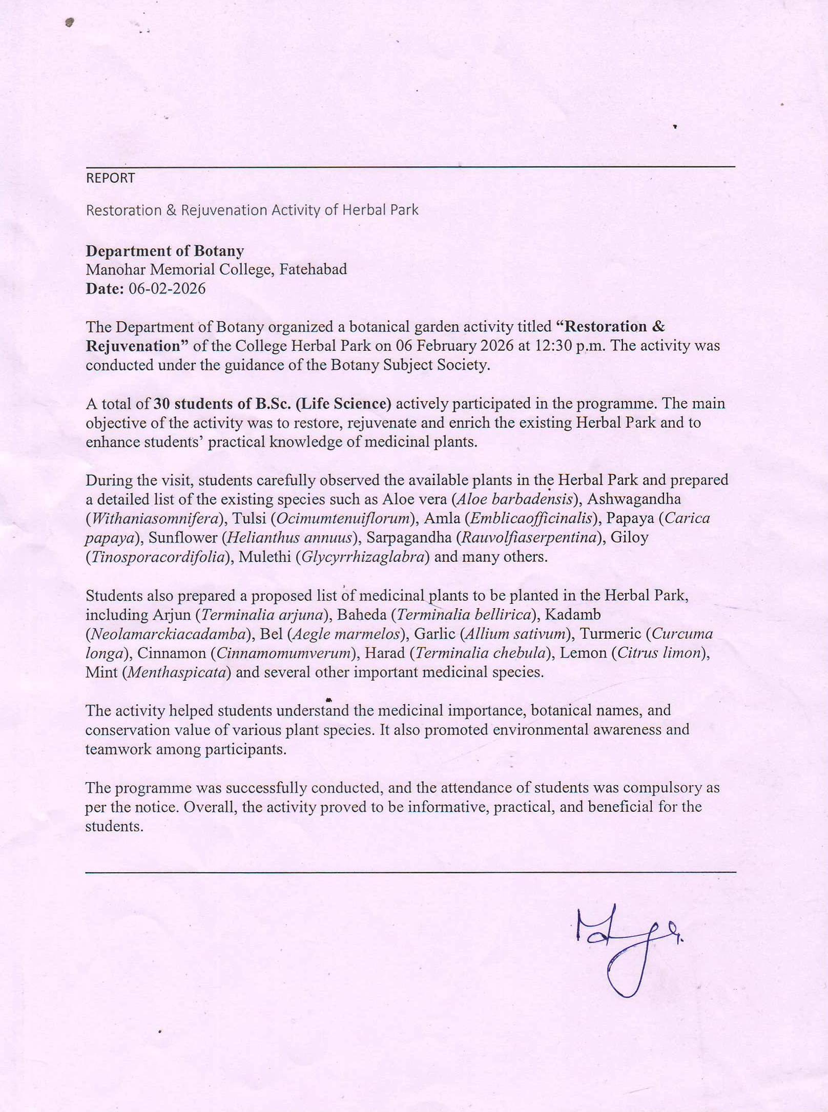 The “Restoration & Rejuvenation” activity of the College Herbal Park was organized by the Department of Botany on 06 February 2026 at 12:30 p.m. The programme aimed to restore, maintain, and enrich the existing Herbal Park while providing practical exposure to students. A total of 30 B.Sc. (Life Science) students participated enthusiastically under the guidance of faculty members. During the activity, students visited the Herbal Park, observed the available medicinal and herbal plants, and recorded their common as well as botanical names. They assessed the condition of plants, identified gaps in plant diversity, and prepared a list of Additional medicinal species to be planted in the future. Students also discussed the medicinal importance, ecological value, and conservation needs of different plant species. The activity promoted environmental awareness, teamwork, and practical learning. It helped students understand plant identification, documentation, and the importance of preserving herbal biodiversity. Overall, the programme was educational, interactive, and beneficial for academic enrichment