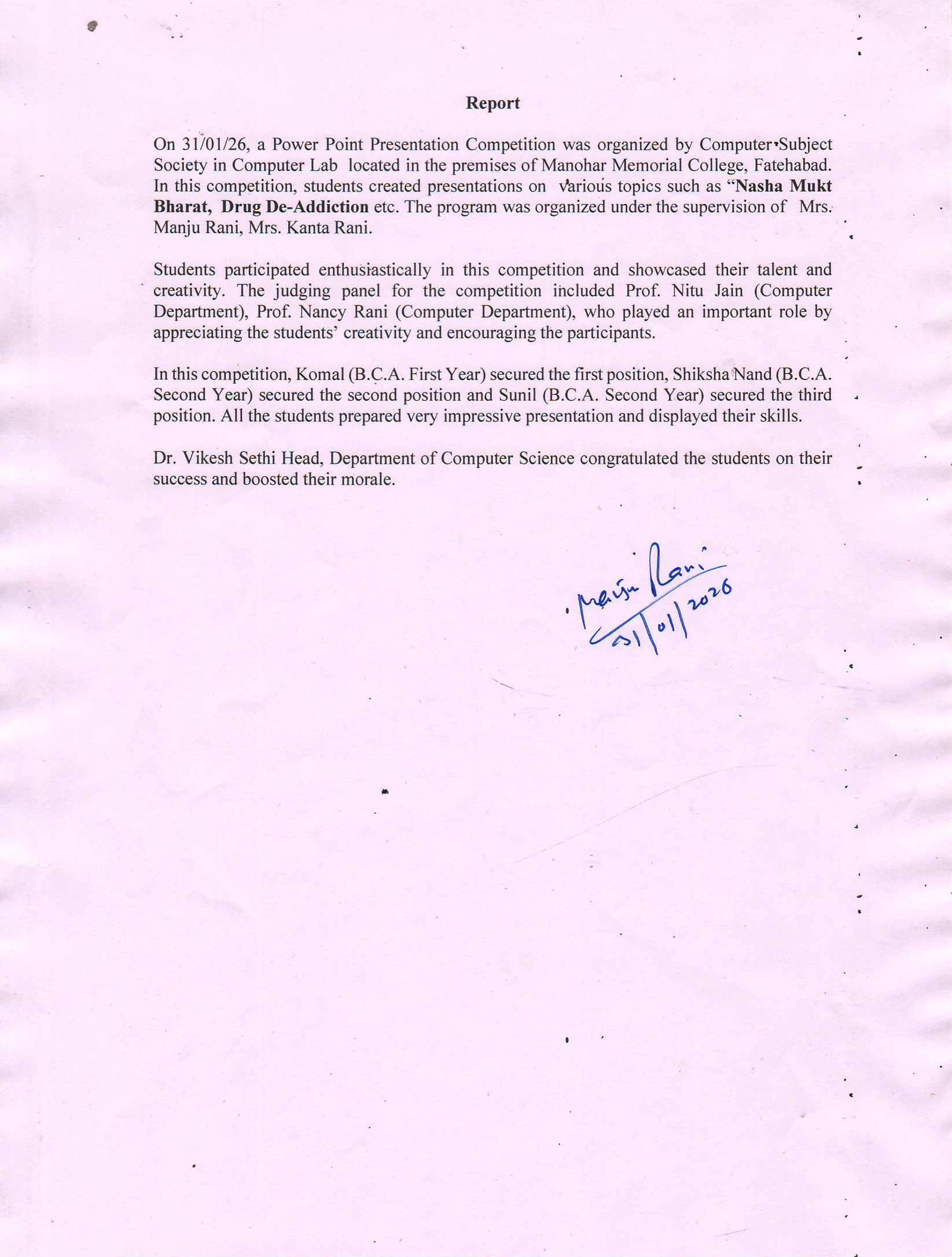 On 31 January 2026, a Power Point Presentation Competition was successfully organized by the Computer Subject Society and Youth Red Cross Department in the Computer Lab of Manohar Memorial College. The event aimed to enhance students’ presentation skills, creativity, and awareness on Drug Abuse. The theme of the competition focused on meaningful topics such as “Nasha Mukt Bharat” and Drug De-Addiction, encouraging students to spread awareness about substance abuse and its impact on society. Students from different classes participated enthusiastically and presented well-structured, informative, and creative presentations. Their confidence, research work, and technical skills were clearly reflected in their slides and delivery. All participants performed remarkably well and demonstrated excellent presentation abilities. The competition concluded successfully with great enthusiasm and encouragement, making it a memorable and inspiring event for all.