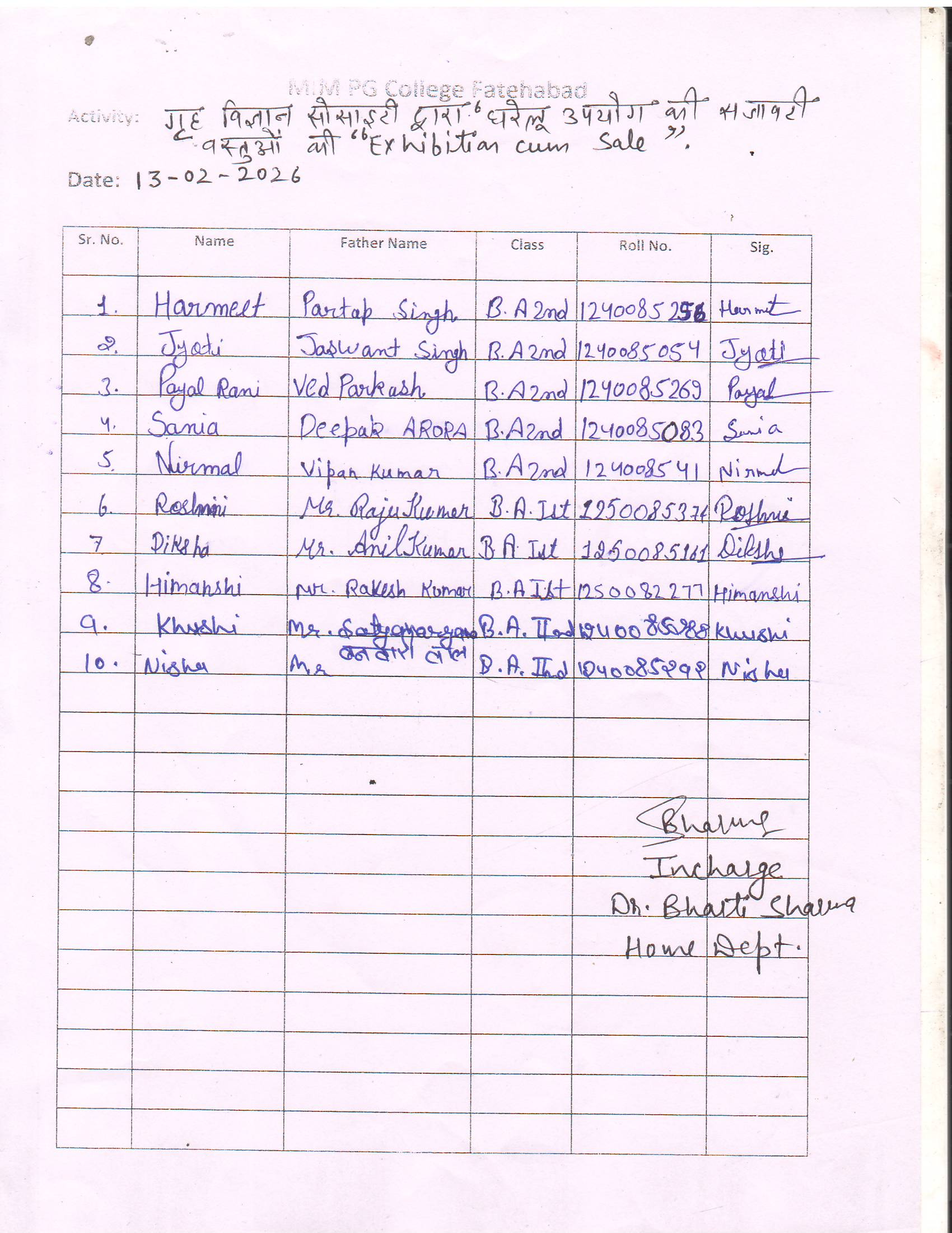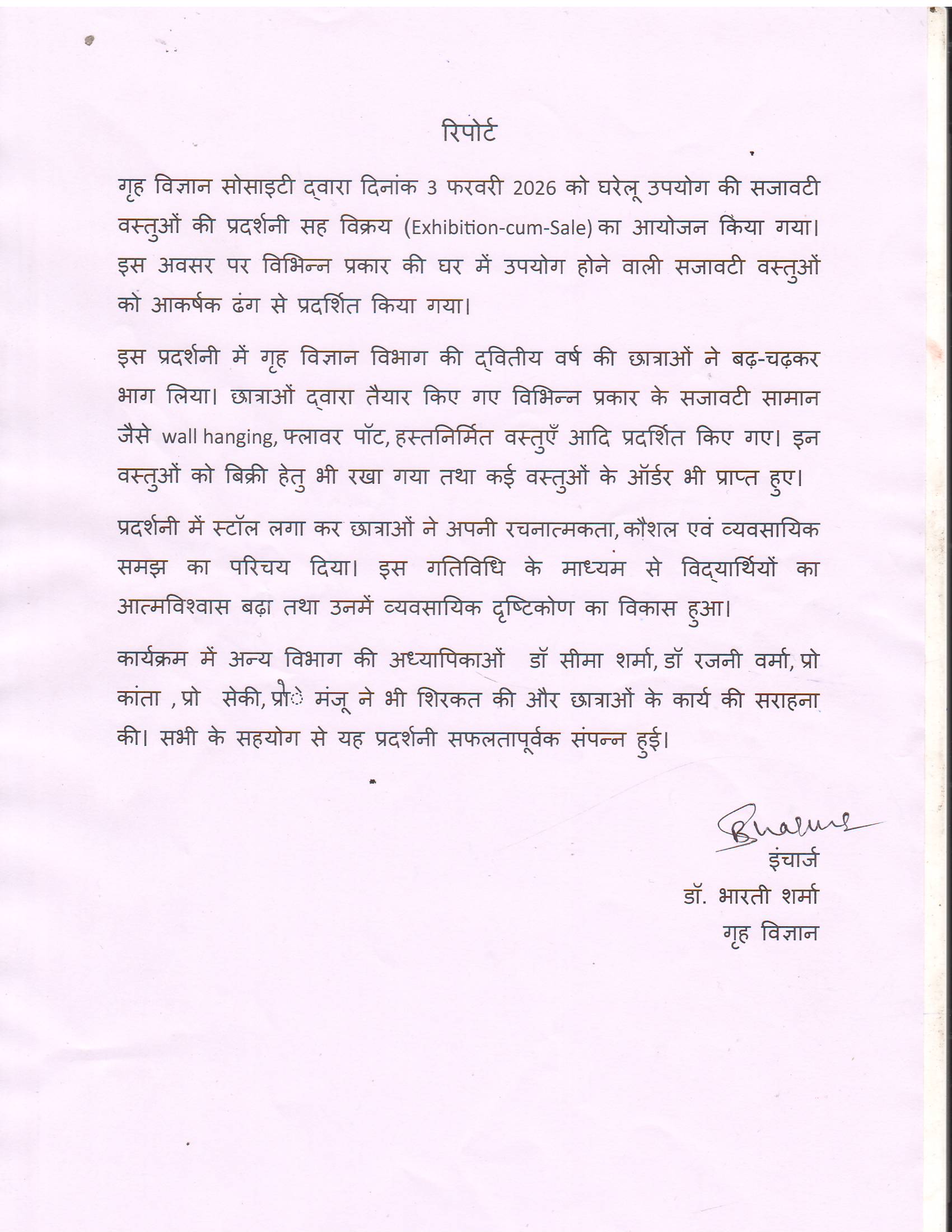 गृह विज्ञान सोसाइटी द्वारा दिनांक 3 फरवरी 2026 को घरेलू उपयोग की सजावटी वस्तुओं की प्रदर्शनी सह विक्रय (Exhibition-cum-Sale) का आयोजन किया गया। इस अवसर पर विभिन्न प्रकार की घर में उपयोग होने वाली सजावटी वस्तुओं को आकर्षक ढंग से प्रदर्शित किया गया। इस प्रदर्शनी में गृह विज्ञान विभाग की द्वितीय वर्ष की छात्राओं ने बढ़-चढ़कर भाग लिया। छात्राओं द्वारा तैयार किए गए विभिन्न प्रकार के सजावटी सामान जैसे wall hanging, फ्लावर पॉट, हस्तनिर्मित वस्तुएँ आदि प्रदर्शित किए गए। इन वस्तुओं को बिक्री हेतु भी रखा गया तथा कई वस्तुओं के ऑर्डर भी प्राप्त हुए। प्रदर्शनी में स्टॉल लगा कर छात्राओं ने अपनी रचनात्मकता, कौशल एवं व्यवसायिक समझ का परिचय दिया। इस गतिविधि के माध्यम से विद्यार्थियों का आत्मविश्वास बढ़ा तथा उनमें व्यवसायिक दृष्टिकोण का विकास हुआ। कार्यक्रम में अन्य विभाग की अध्यापिकाओं डॉ सीमा शर्मा, डॉ रजनी वर्मा, प्रो कांता , प्रो सेकी, प्राे मंजू ने भी शिरकत की और छात्राओं के कार्य की सराहना की। सभी के सहयोग से यह प्रदर्शनी सफलतापूर्वक संपन्न हुई।
