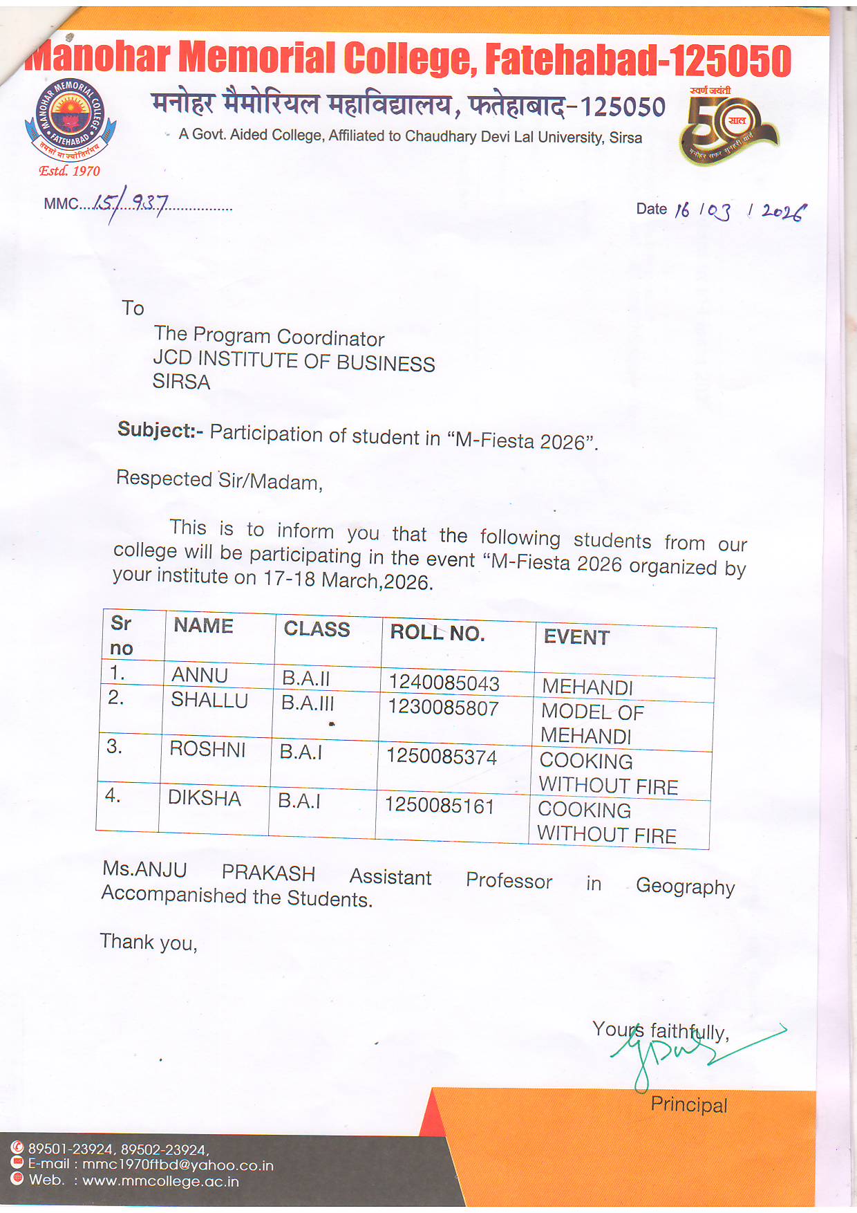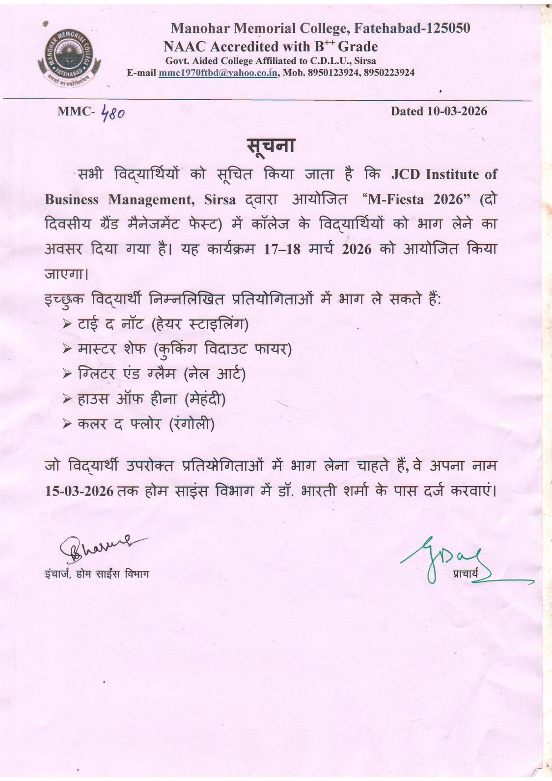 दिनांक 17 मार्च 2026 को JCD में विभिन्न प्रतियोगिताओं का आयोजन किया गया, जिसमें हमारे संस्थान के छात्रों ने उत्साहपूर्वक भाग लिया। इन प्रतियोगिताओं में मेहंदी प्रतियोगिता तथा फायर के बिना कुकिंग (Cooking Without Fire) प्रतियोगिता शामिल थीं।