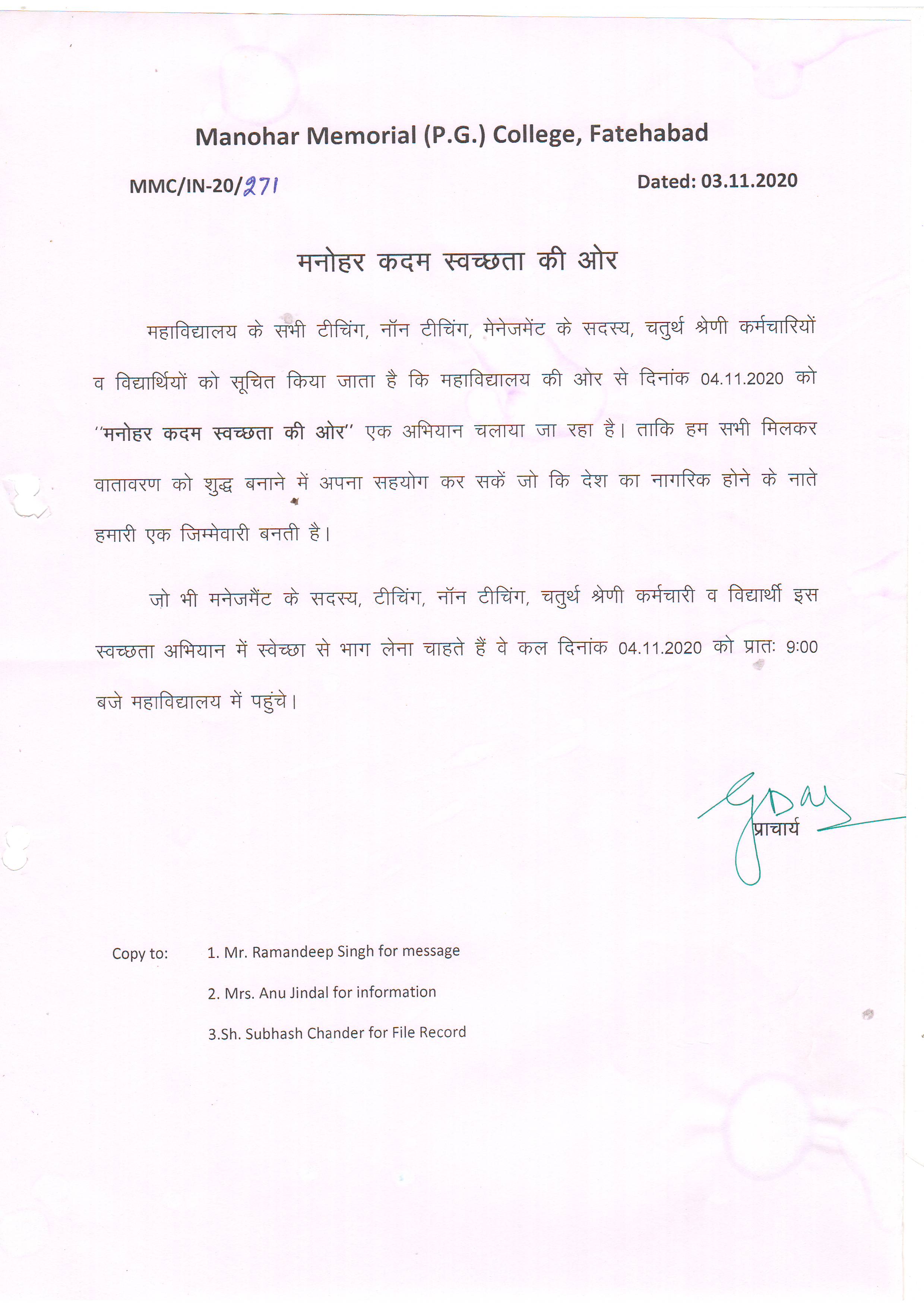आज सफ़ाई अभियान में जो स्टाफ़ मेम्बर्ज़ व मैनज्मेंट के सदस्य कॉलेज पहुँचे का बहुत बहुत आभार। विशेष रूप से श्री विनोद मेहता जी, श्री रमेश सचदेवा जी, श्री राजेश गेरा जी, मल्होत्रा जी, प्रफ़ेसर विनोद,जतिंदर बत्रा व मैडम अनु का धन्यवाद। आज सभी मेरे साथी सेवादारों ने बहुत मेहनत की मैं उन सभी को बधाई देता हूँ। आपका गुरचरन दास प्रिन्सिपल