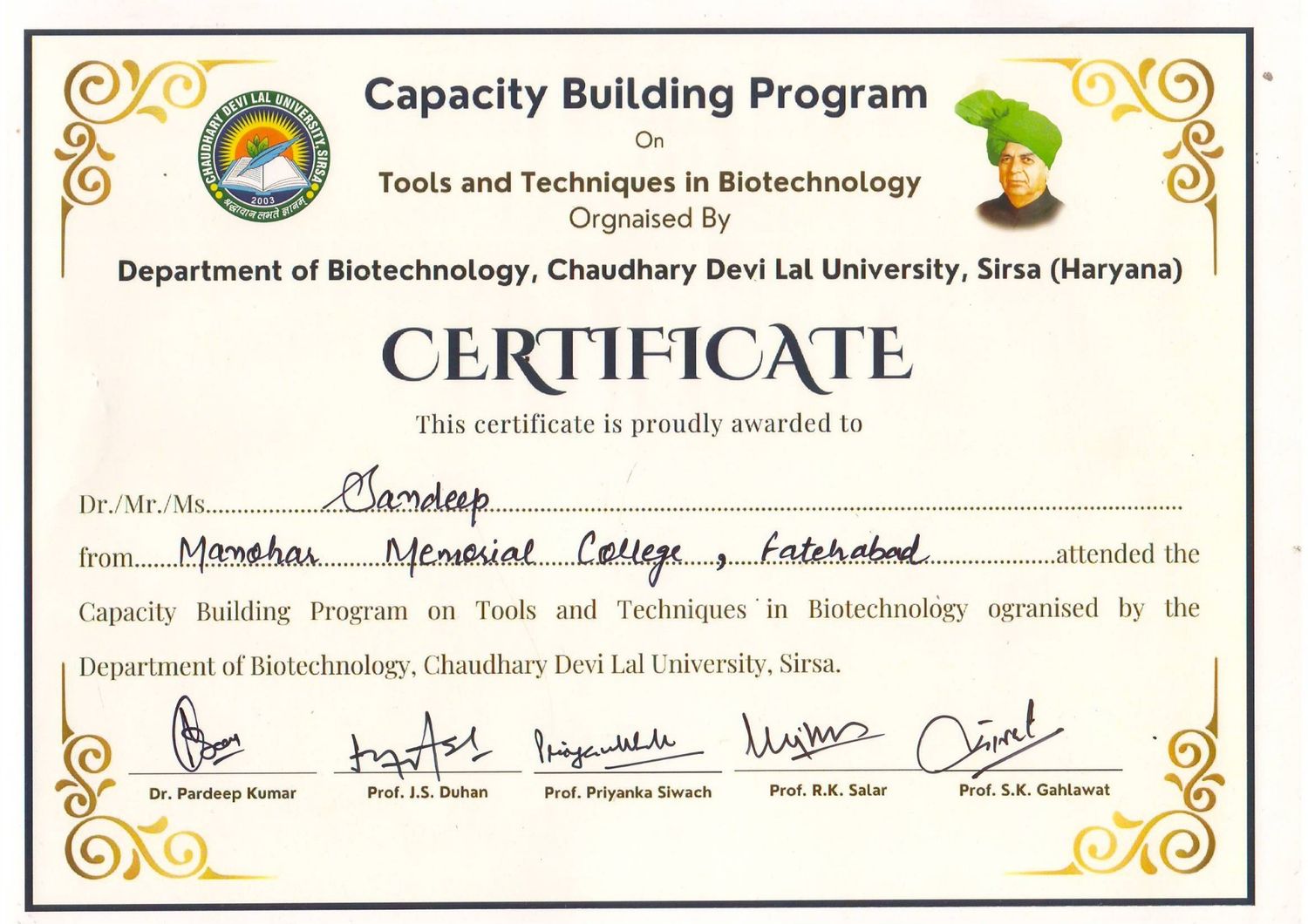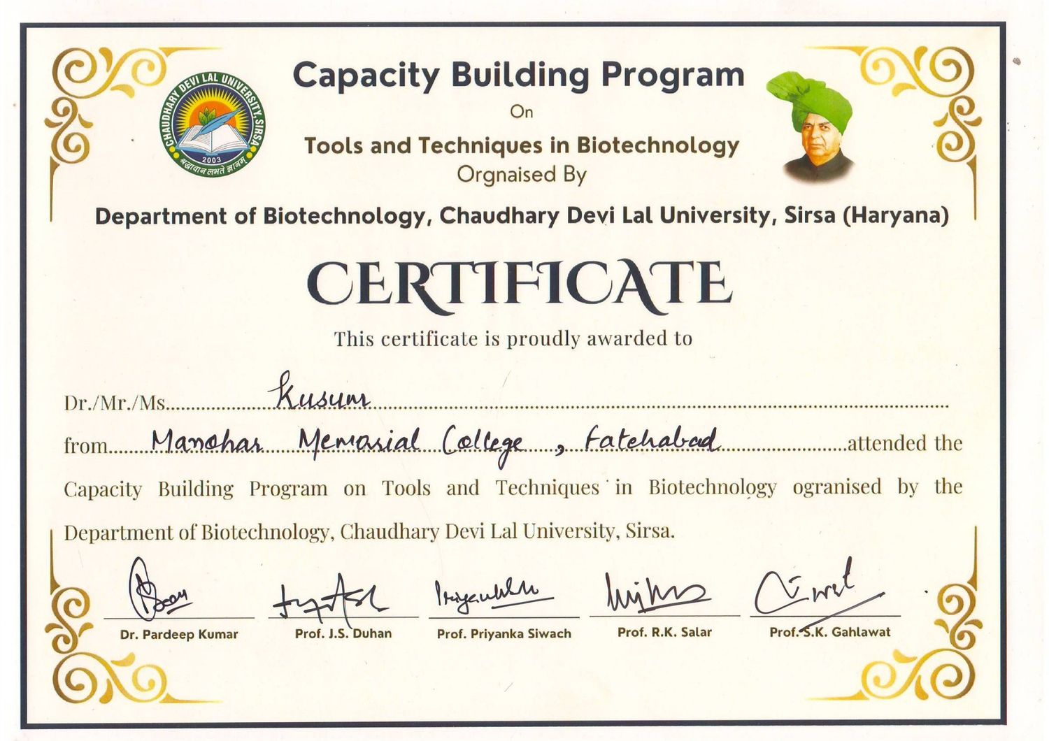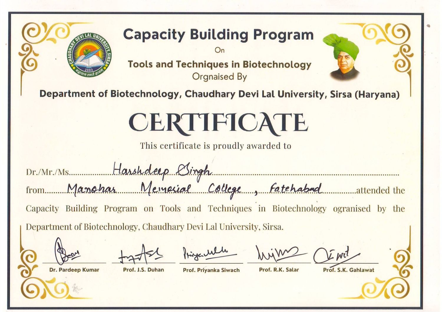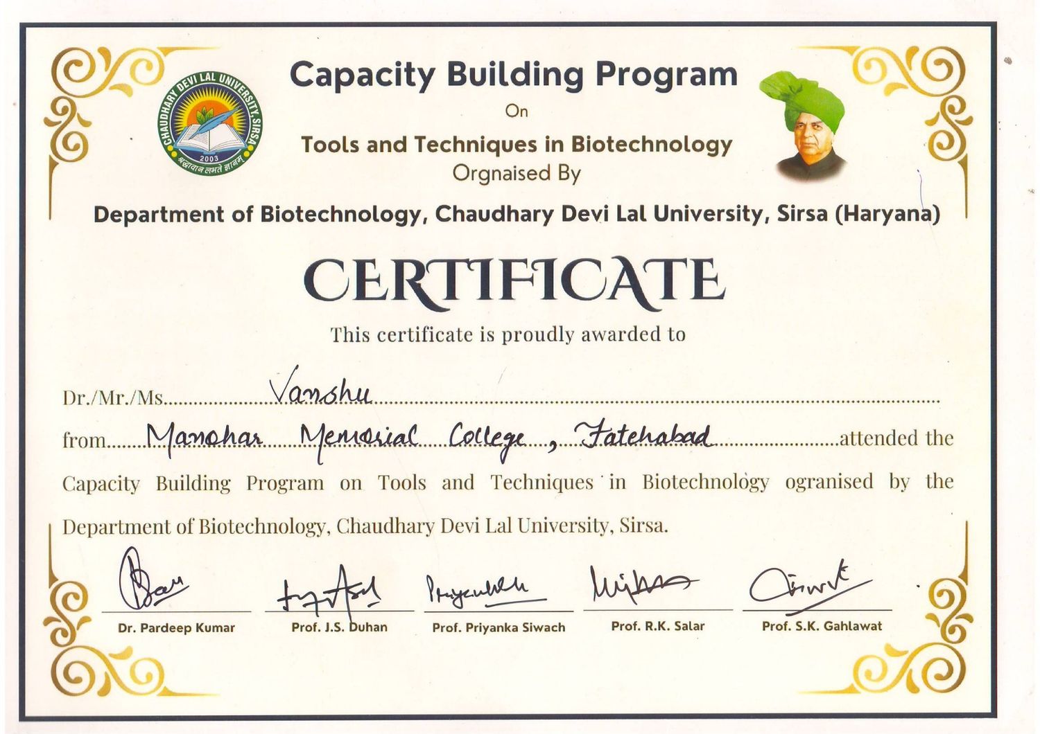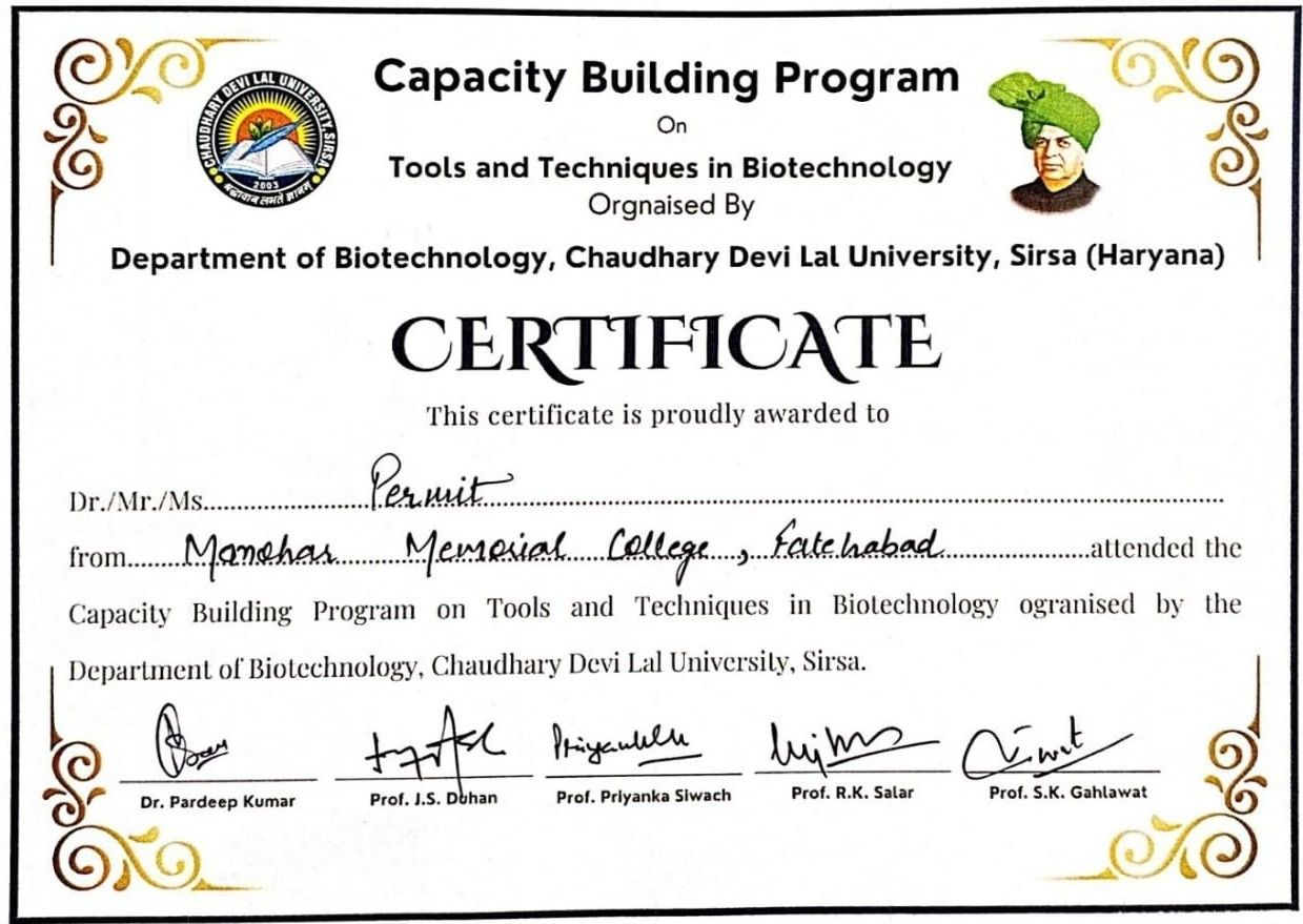 The B.Sc. Final Year students of M.M. College attended a one-day Capacity Building Workshop organized by the Department of Biotechnology at , Sirsa, on 23 February 2026. The students were accompanied by Ms. Manju and Mr. Mukul (Assistant Professor). The workshop aimed to enhance scientific knowledge, practical skills, and career awareness in the field of biotechnology. The program began with registration followed by an introductory session. Students were divided into groups and provided hands-on exposure in various laboratories including Microbiology Lab, Molecular Biology Lab, Plant Biotechnology Lab, Animal Biotechnology Lab, and the Central Instrumentation Lab. During the lab visits, students observed modern equipment, experimental techniques, and research procedures. Faculty members and research scholars demonstrated laboratory practices and explained the practical applications of biotechnology in research and industry. The workshop also included interactive sessions with experts, where students gained valuable guidance regarding higher education opportunities and career prospects in life sciences. The program concluded with certificate distribution. Overall, the workshop was highly informative, practical, and beneficial for enhancing students’ academic knowledge and professional skills.