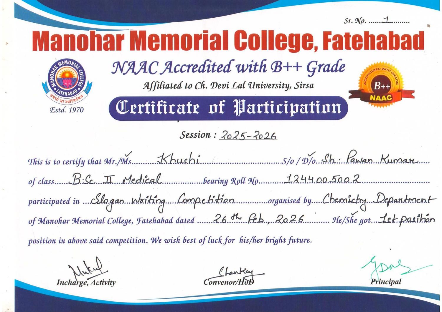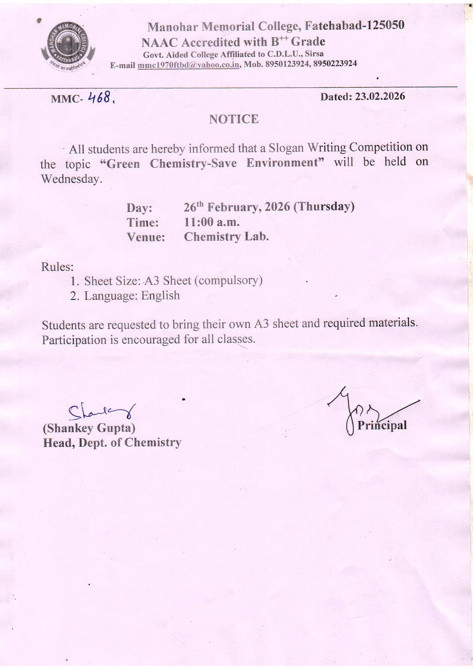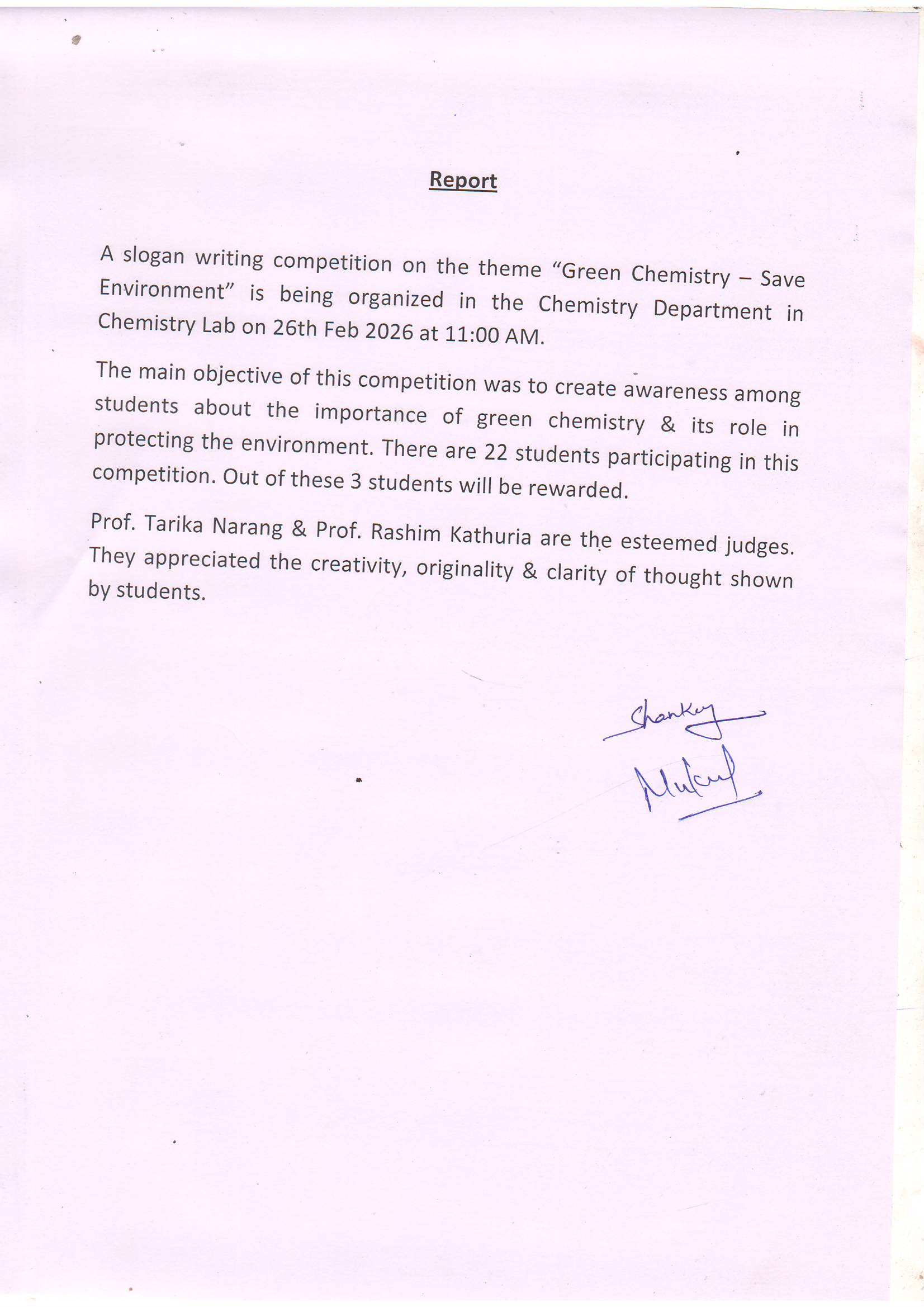 A slogan writing competition on the theme “Green Chemistry – Save Environment” is being organized in the Chemistry Department in Chemistry Lab on 26th Feb 2026 at 11:00 AM.