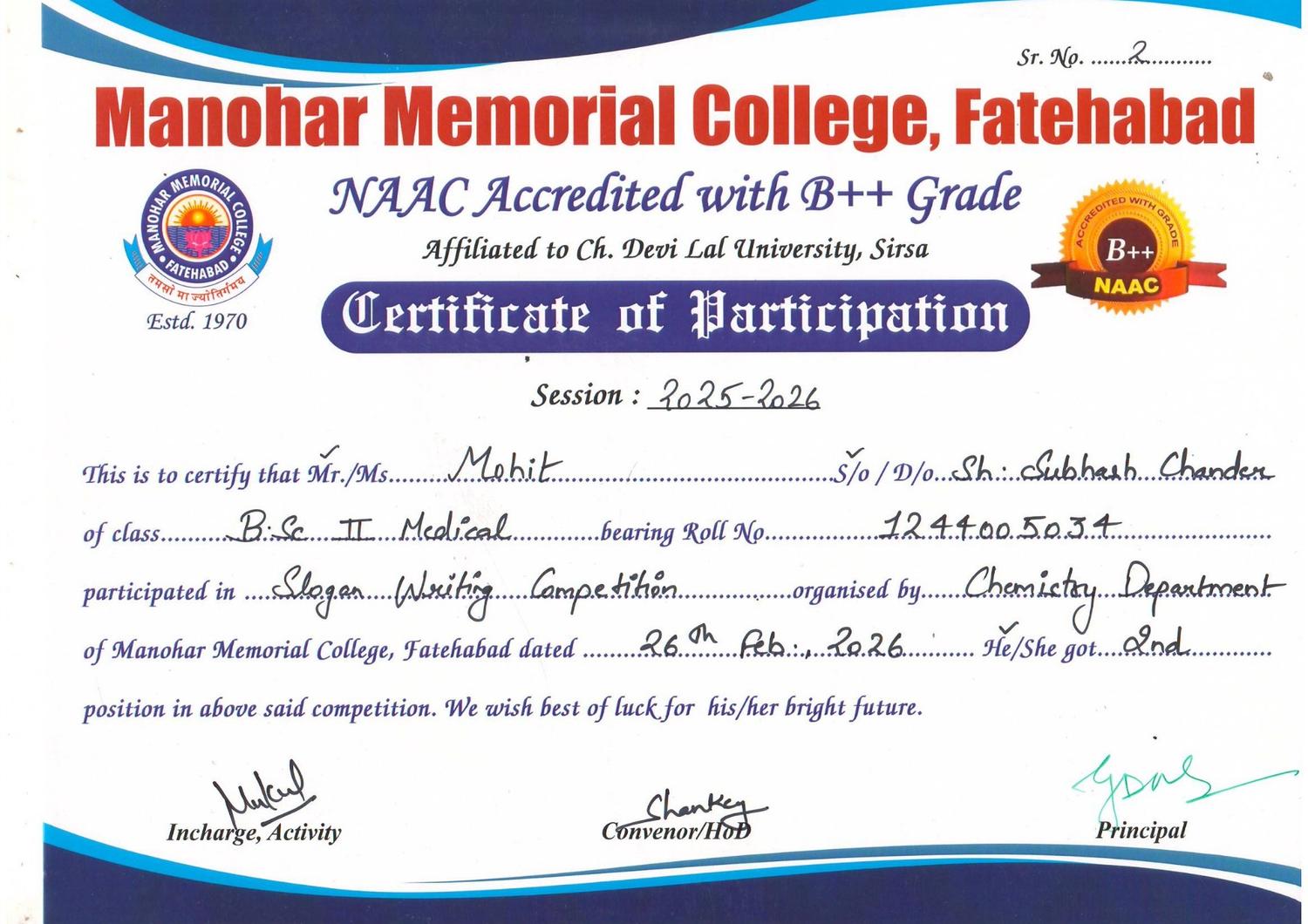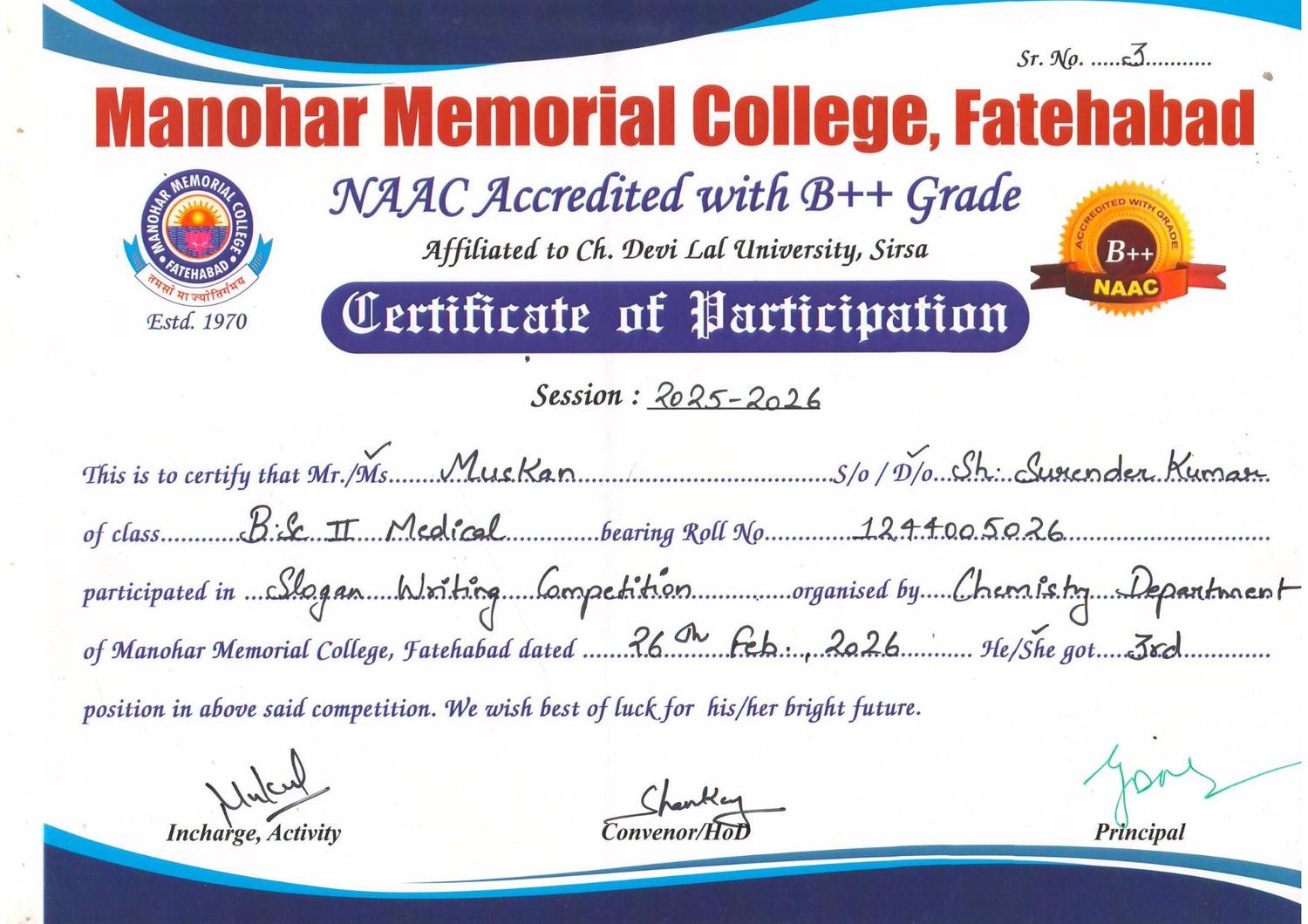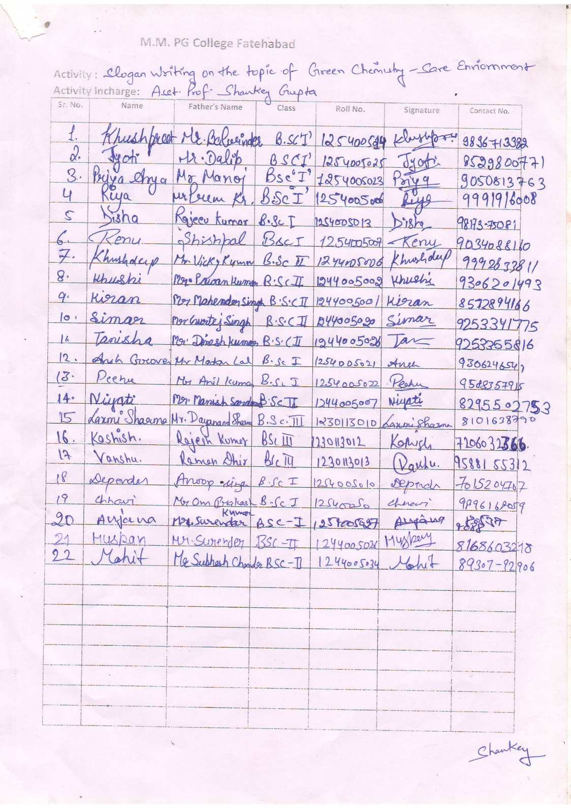A slogan writing competition on the theme “Green Chemistry – Save Environment” is being organized in the Chemistry Department in Chemistry Lab on 26th Feb 2026 at 11:00 AM.