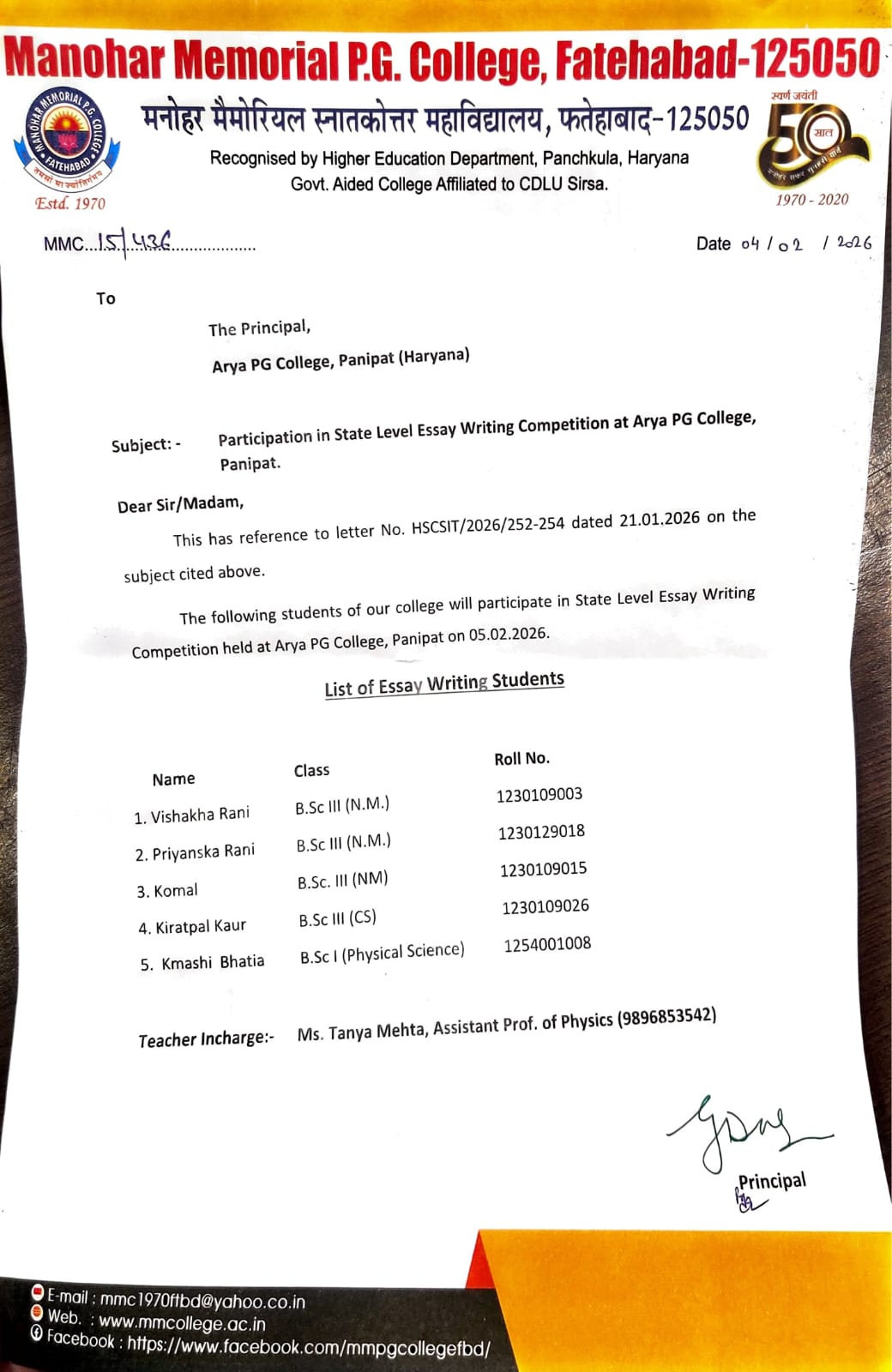 STUDENTS PARTICIPATED IN STATE LEVEL SCIENCE ESSAY WRITING COMPETITION AT ARYA PG COLLEGE ,PANIPAT (HARYANA )