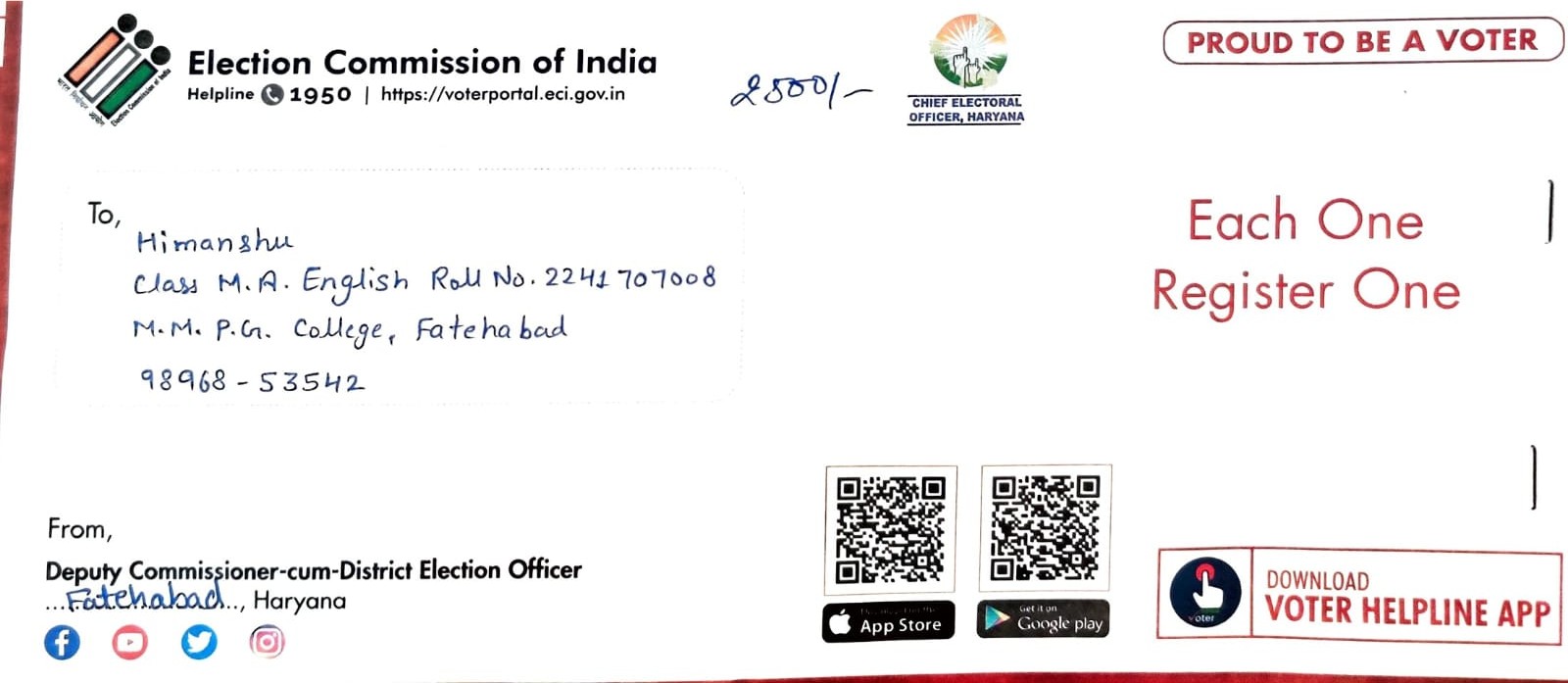 Students Were Honoured Form ADC Sir Fatehabad on National Voter's Day.