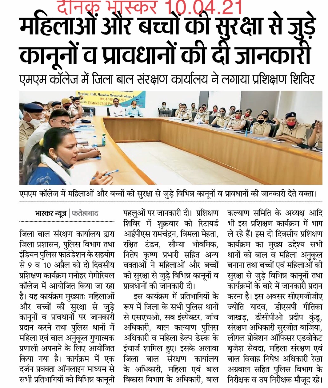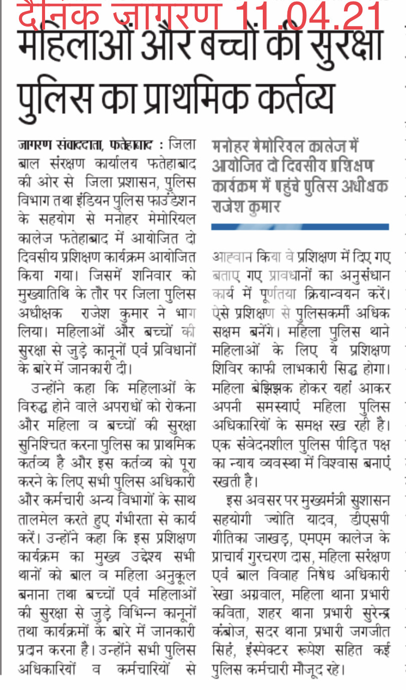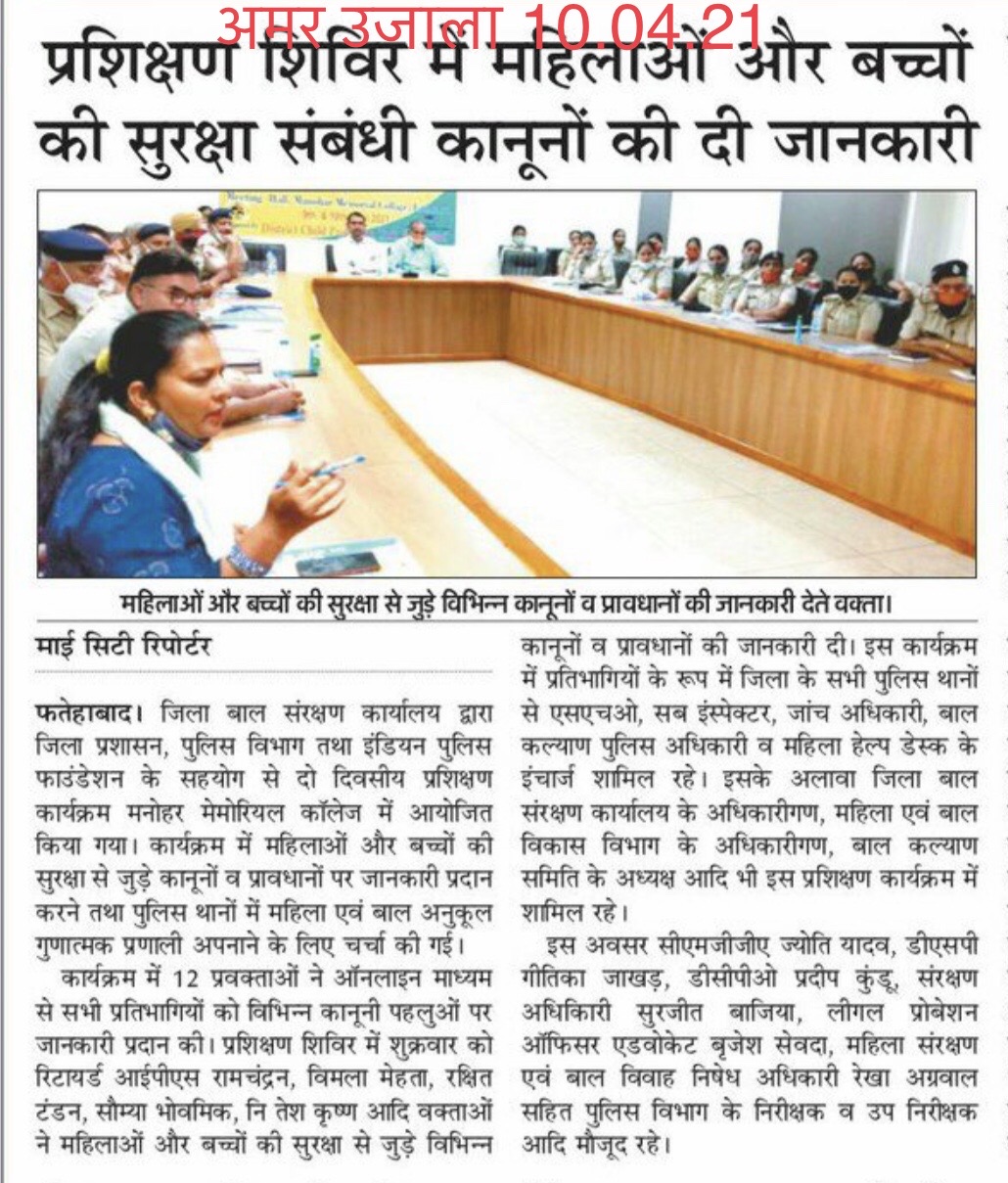 Two Day District Level Training Programme on Protection of the Rights of the Women & Children Gender Sensitive Policing & Inter Departmental Coordination in Collaboration with Indian Police Foundation Organised by District Child Protection Unit.