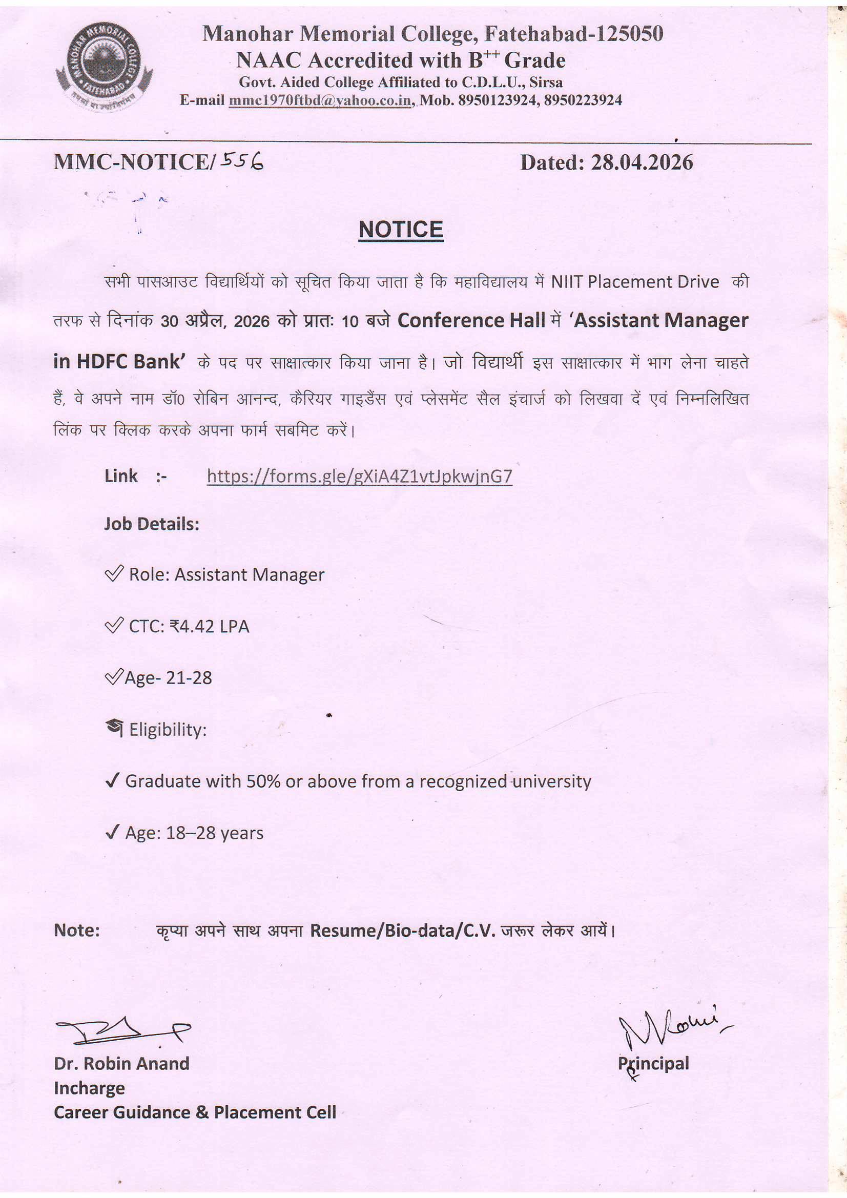 Notice for Interview of Assistant Manager in HDFC Bank. (556)