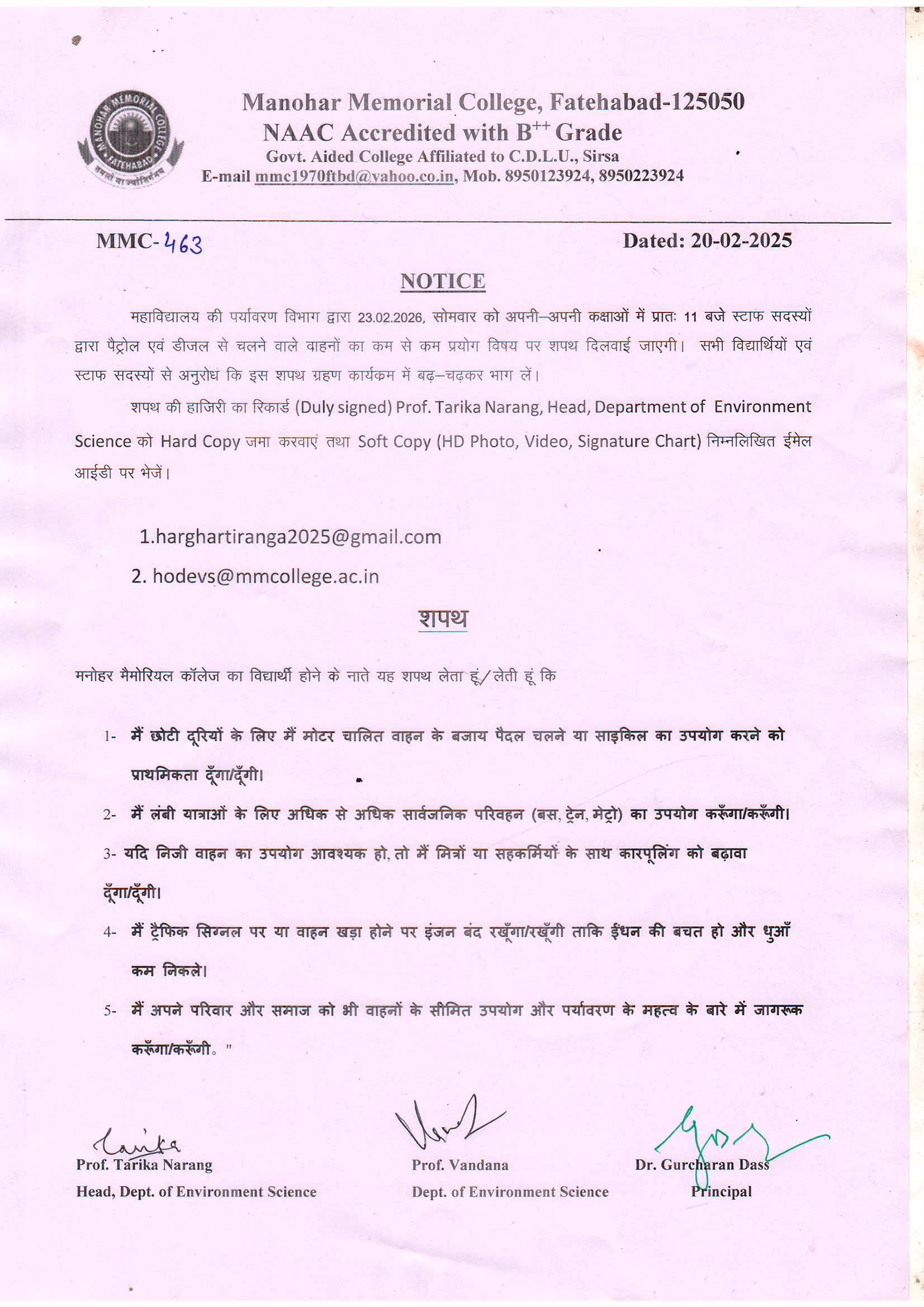 Notice For वाहनों के सिमित उपयोग और पर्यावरण के महत्व के बारे (463)
