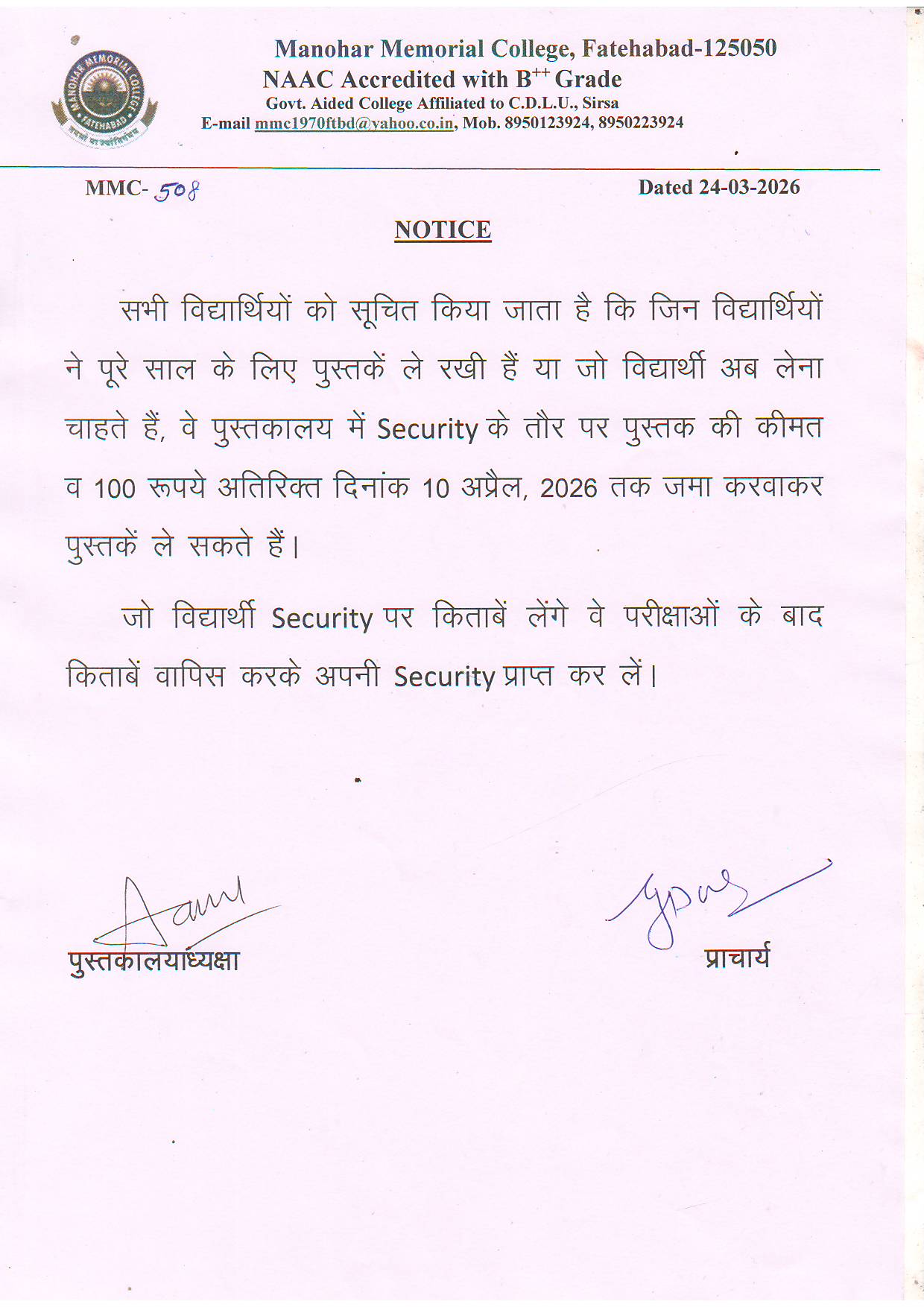 Notice for लाइब्रेरी से पुस्तके लेने बारे (508)