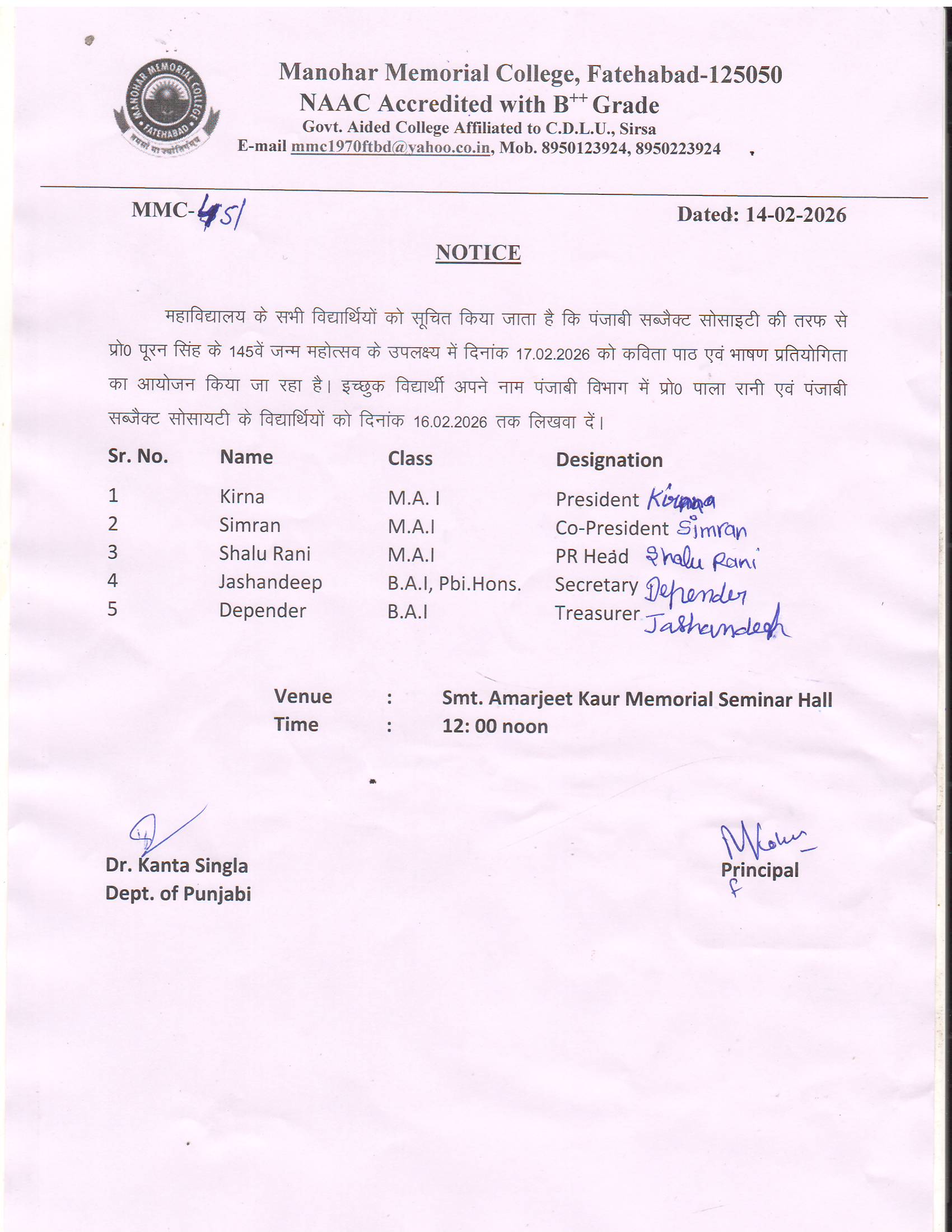 Notice For प्रोफेसर पूरन सिंह के 145वें जन्म महोत्सव के उपलक्ष मे(451)