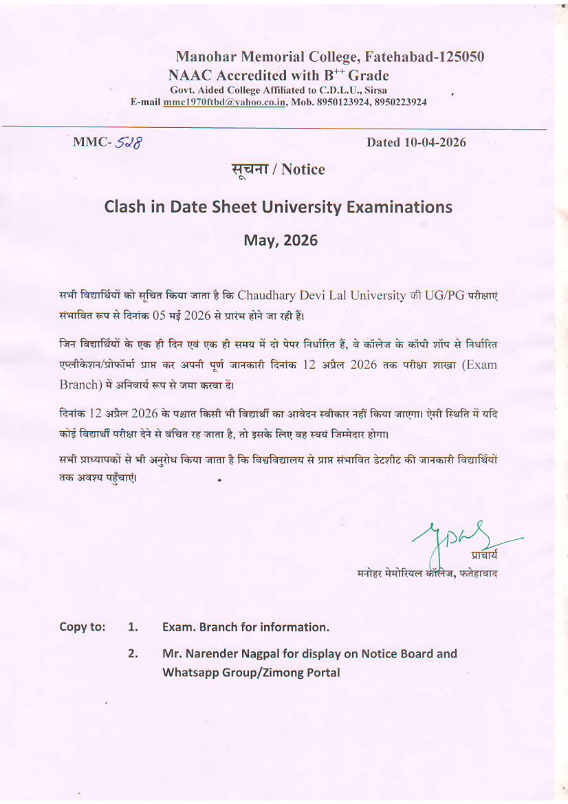 Notice for Clash in Date Sheet University Examination May, 2026 (528)