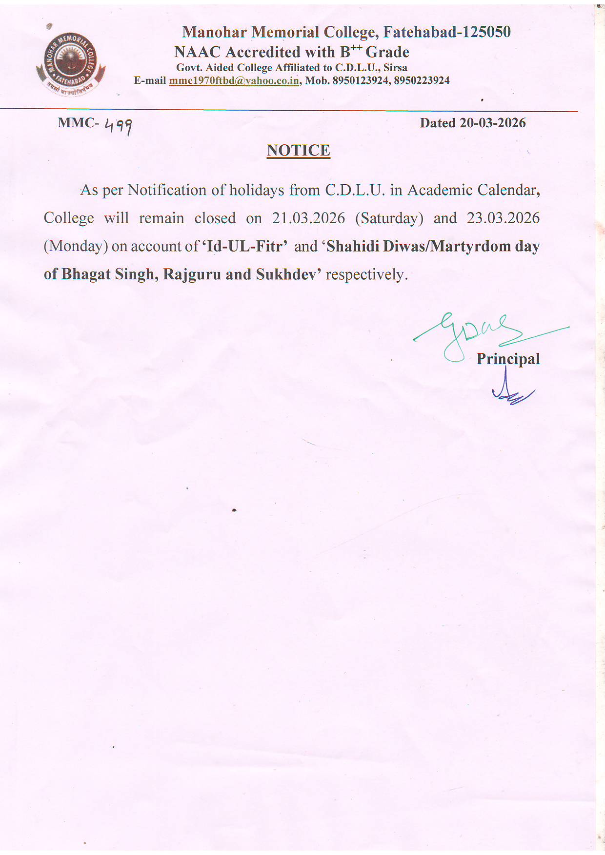 Notice for Id -UL- Fitr and Shahidi Diwas/ Martydom day of Bhagat Singh, Rajguru and Gukhdev (499)